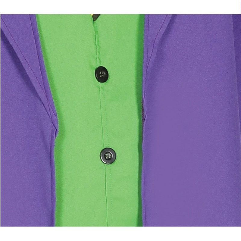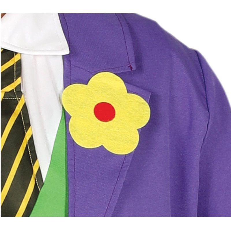 Crazy assassin-jester costume consists of a long sleeved trench raincoat in purple with a flower, a shirt, a green waistcoat and a black and yellow striped tie. Crazy assassin-jester costume is a great choice for your fancy dress or any other party!