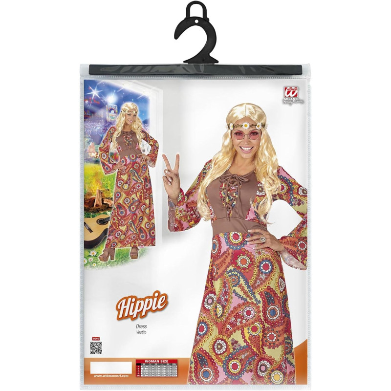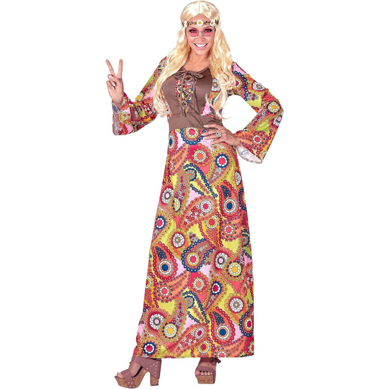 Are you a fan of Flower Power time? Then this costume is just the thing for you. Included is a hippie girl costume, consisting of a long colored dress with brown lacing in the chest area.