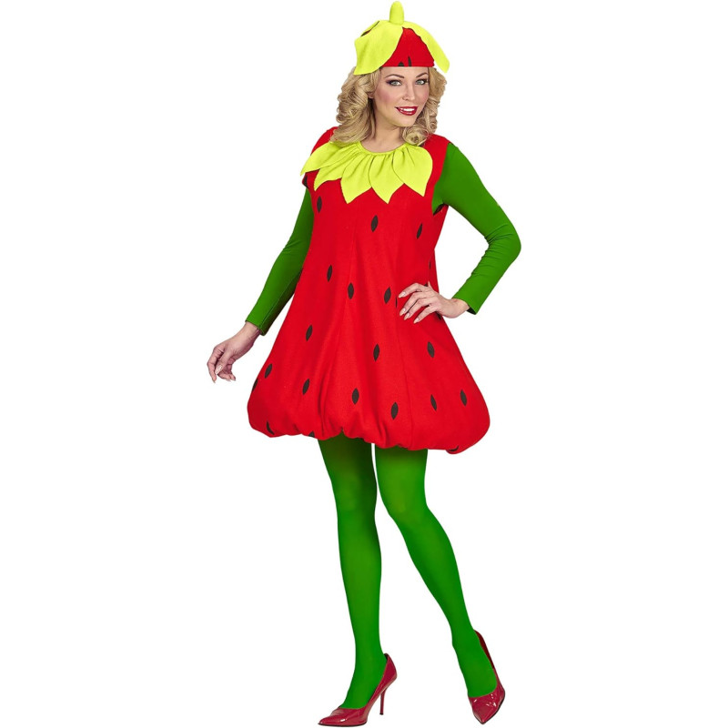 Strawberry costume for adult includes dress and headpiece.