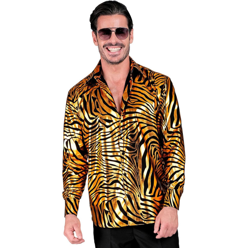 With this eye-catching fashion shirt you can transform yourself into a wild party animal. The men’s shirt is designed in a shiny gold and decorated with black zebra stripes. It is equipped with long sleeves and a stand-up collar. Be ready to be in the spotlight, be it at a carnival party or a New Year’s Eve themed party.