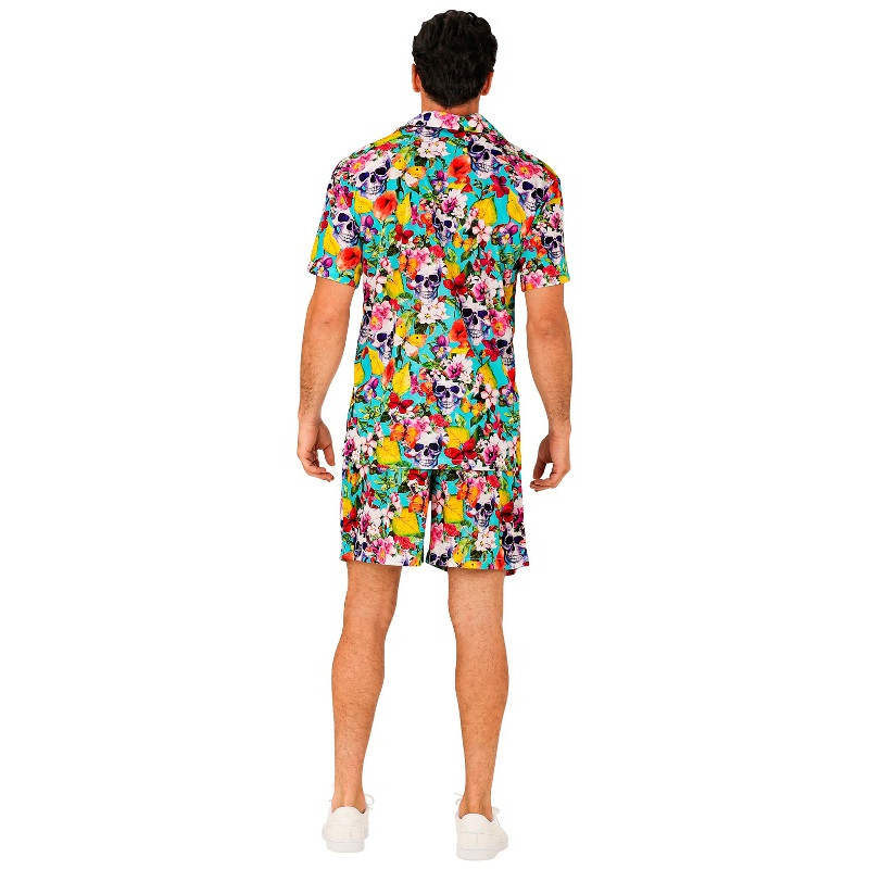 Elevate your summer wardrobe with our men’s suit featuring a bold and colorful skull and flowers print. This eye-catching set includes a matching shirt and shorts, both crafted from 100% lightweight polyester for a comfortable and breathable fit. Perfect for beach parties, festivals, or casual outings, this unique ensemble ensures you’ll make a stylish statement wherever you go.