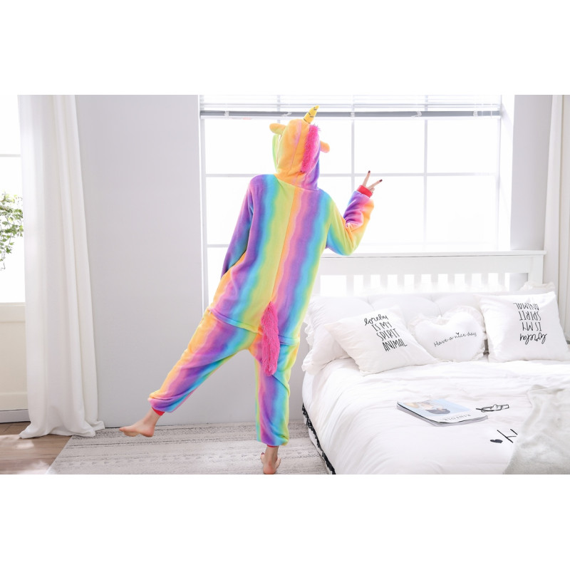 Elevate your comfort and style with this vibrant unicorn onesie. Crafted with attention to detail, the rainbow-colored attire ensures ultimate coziness and delight. Perfect for lounging at home or adding a touch of whimsy to your events, this onesie embodies a playful yet sophisticated charm.