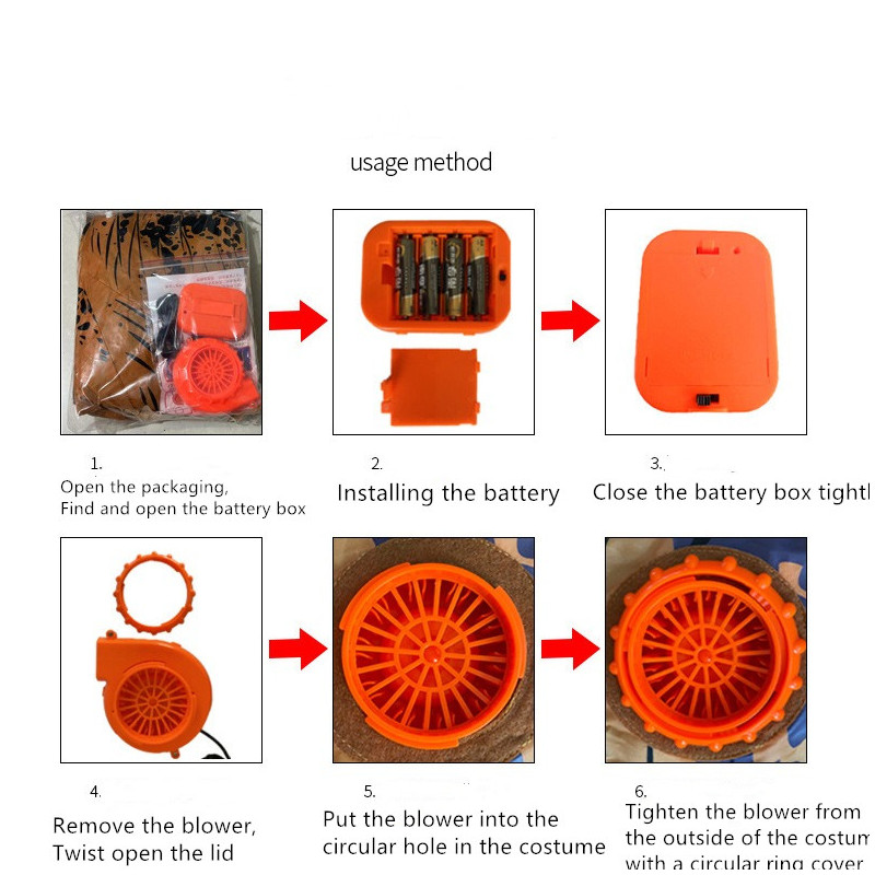 Inflatable alien costume for adults 150-190 cm height. Consists of costume and fan. The fan works from 4 pcs. AA batteries (not included) or via USB connection.