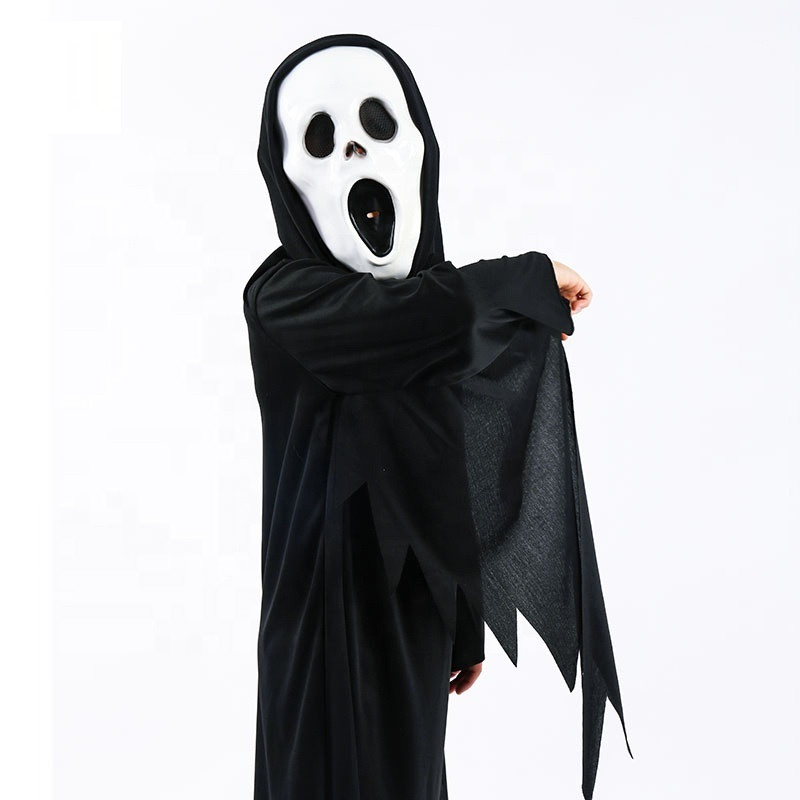 This ghost costume features a long black cloak with wide, jagged sleeves that create a dramatic and mysterious look. The included white mask enhances the spooky effect and helps create a complete ghost appearance.