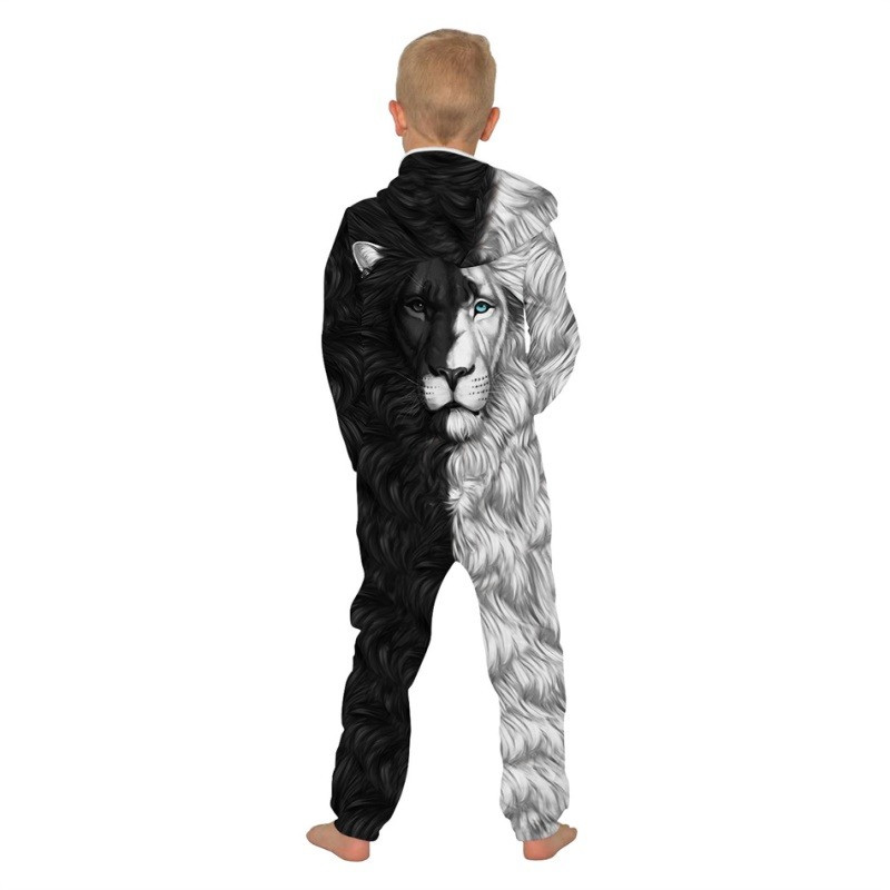 Kids costume with 3D lion print – a stylish and comfortable hooded jumpsuit perfect for Halloween, carnival parties, themed events or everyday lounging.