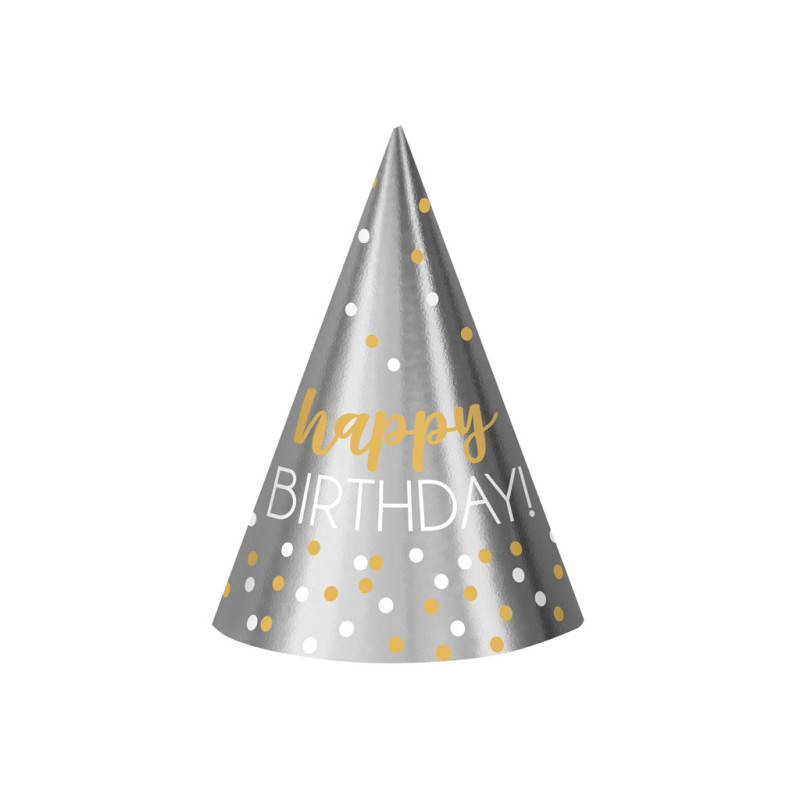 Happy Birthday Party Hats are a stylish and practical party accessory, ideal for birthdays and celebrations of all ages. The silver design with decorative dots and “Happy Birthday” lettering creates an elegant festive atmosphere and pairs beautifully with balloons, table décor and other party decorations.
