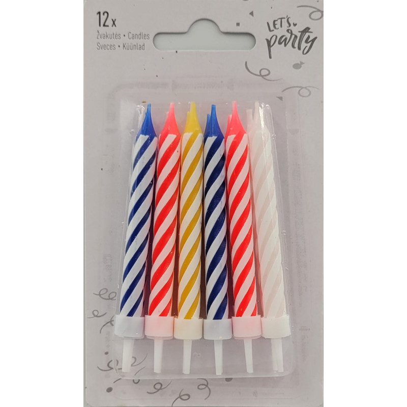Spiral birthday candles in various colors: 12 pcs. (with plastic holders).
