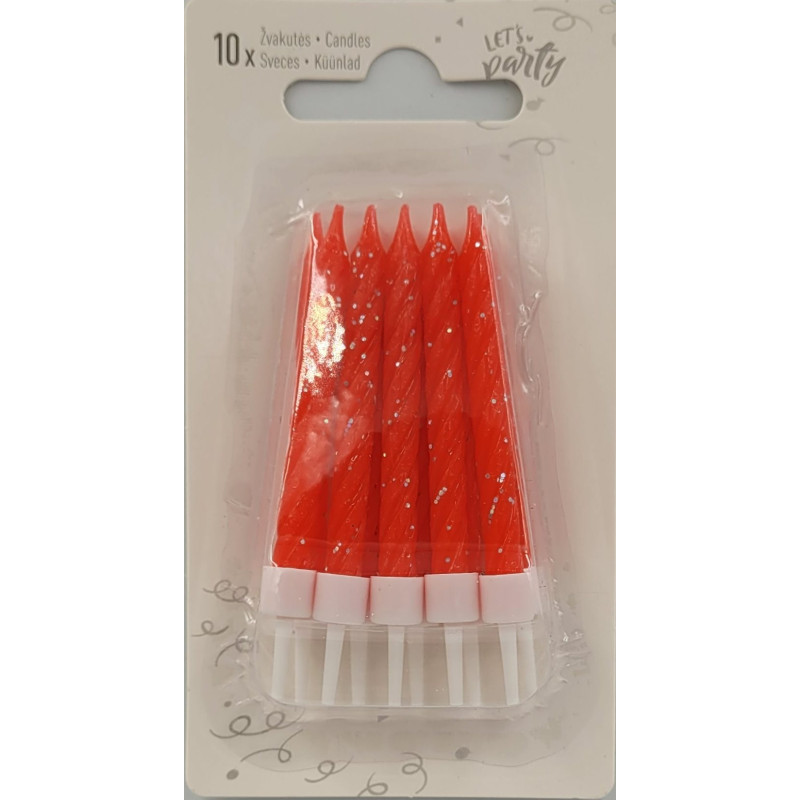 Rozā dzimšanas dienas svecītes: 10 gab. (ar plastmasas turētājiem).