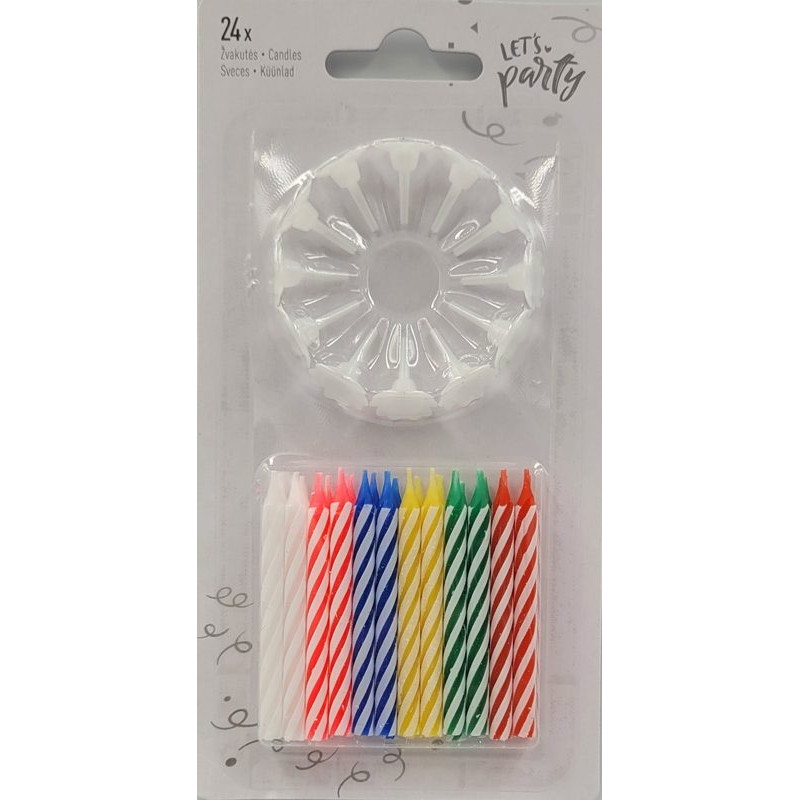 Spirālveida dzimšanas dienas svecītes dažādās krāsās: 24 gab. (ar 12 plastmasas turētājiem).