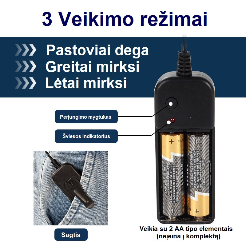 3 darbības režīmi: pastāvīgs, ātri mirgojošs, lēni mirgojošs.
