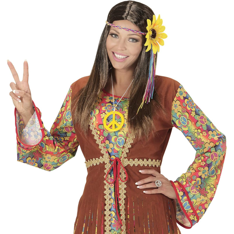 Brūna „Hippie parūka ar daudzkrāsainu saulespuķu galvas stīpu”. Ziedu lentes pinuma parūka. Izmērs: viens izmērs. Universāla, ideāli piemērota hipiju tērpiem. Karnevāliem, tematiskām ballītēm vai citiem maskēšanās pasākumiem. Materiāls: 100% poliesters. Mazgāt ar rokām, balināt nedrīkst, nežāvēt žāvētājā, nedzelzt, neķīmiski tīrīt.
