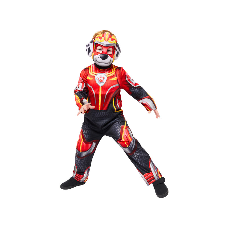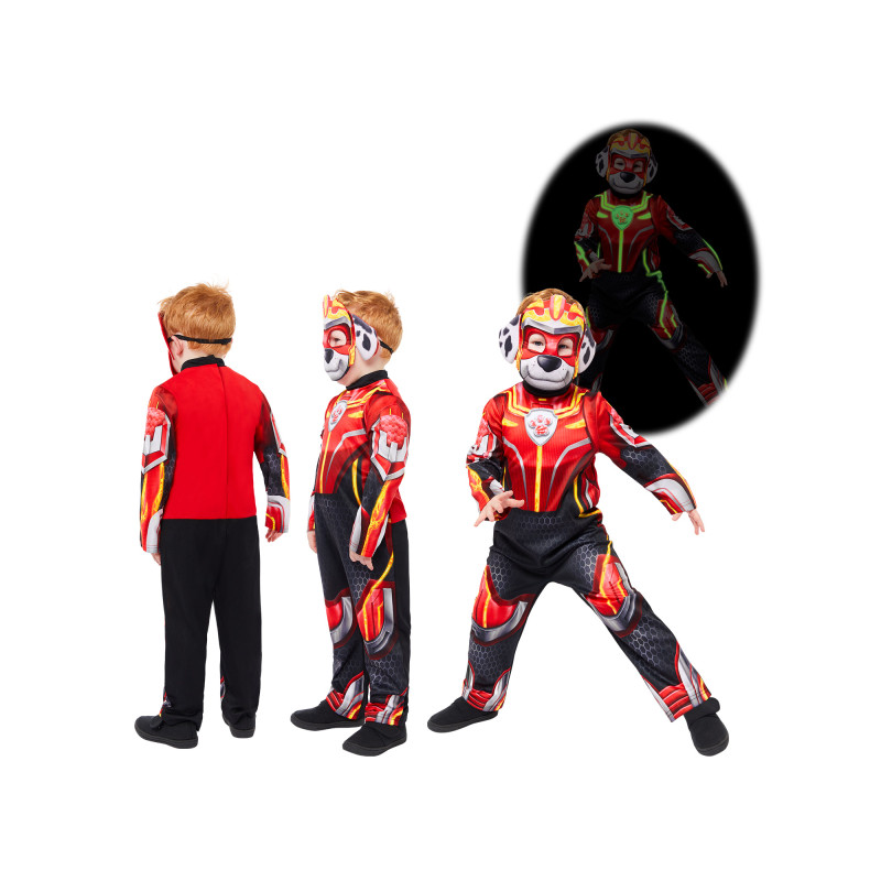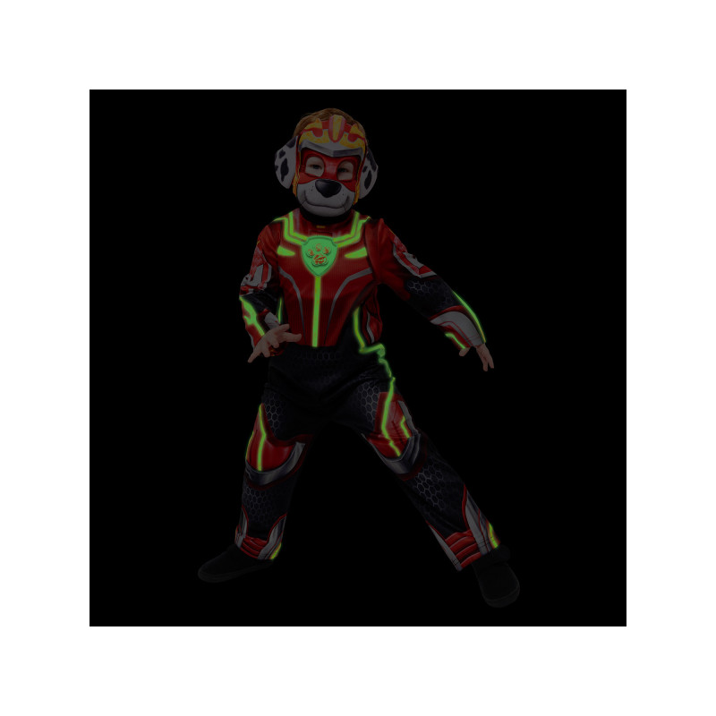 „Paw Patrol Marshall“ kostīms bērniem ar spīdīgām tumšās gaismas detaļām. Komplektā ietilpst kombinezons un Marshall maska – lieliska izvēle maziem ugunsdzēsējiem!