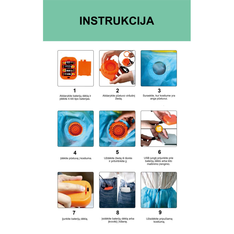 Piepūšamais vienradža kostīms bērniem - jautrs kostīms, kas liek bērnam izskatīties, it kā viņš jāj uz vienradža. Piemērots bērniem ar augumu no 120 līdz 145 cm. Komplektā ietilpst ar 4 AA baterijām (nav iekļautas) vai USB savienojumu darbināms ventilators.