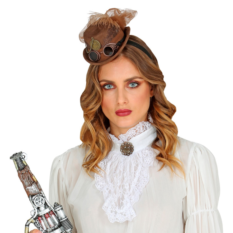 Izgatavots no augstas kvalitātes materiāliem, lente ērti turas uz galvas un nodrošina komfortu pat ilgākās pasākumu laikā. Mini cepurīte ir smalki rotāta ar detaļām, piemēram, izšūjumiem, spalvām vai zobeniem, kas vēl vairāk uzsvēra steampunk estētiku. Tas ir ideāls izvēle tiem, kuri vēlas izcelties un piešķirt savam tēlam radošumu un eleganci!