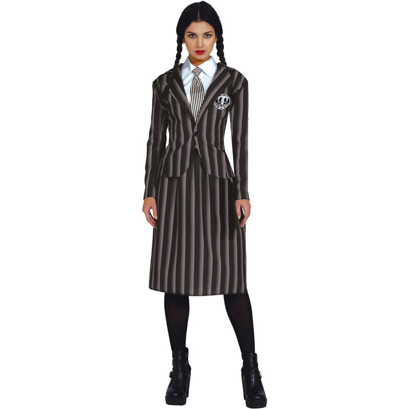 Šī gotiskā ģimenes meiteņu skolas formas Halovīna kostīms pieaugušajām sievietēm satur: jaka, krekls ar kaklasaiti, svārki • MATERIĀLI: Šis Halovīna kostīms pieaugušajām ir izgatavots no poliestera un atbilst visiem drošības standartiem, lai jūs varētu lieliski pavadīt laiku nākamajā kostīmu ballē. • Halovīna Kostīmi sievietēm: lieliska izvēle jūsu tērpu ballītei vai tematiskajai ballītei