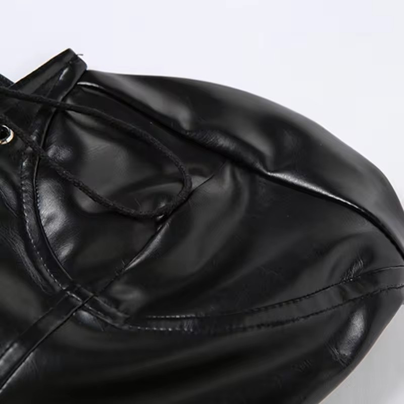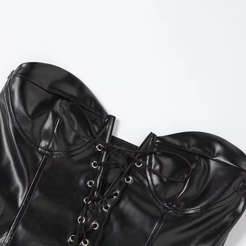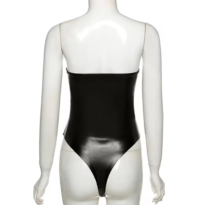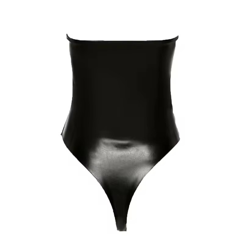 Sieviešu PU ādas bezplecu bodijs ar šnērējamu auklu augstā griezumā.