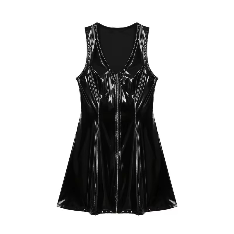 Sieviešu V-veida kakla rāvējslēdzēja pieguļoša kleita no lakādas bez piedurknēm ar izplestiem sāniem.