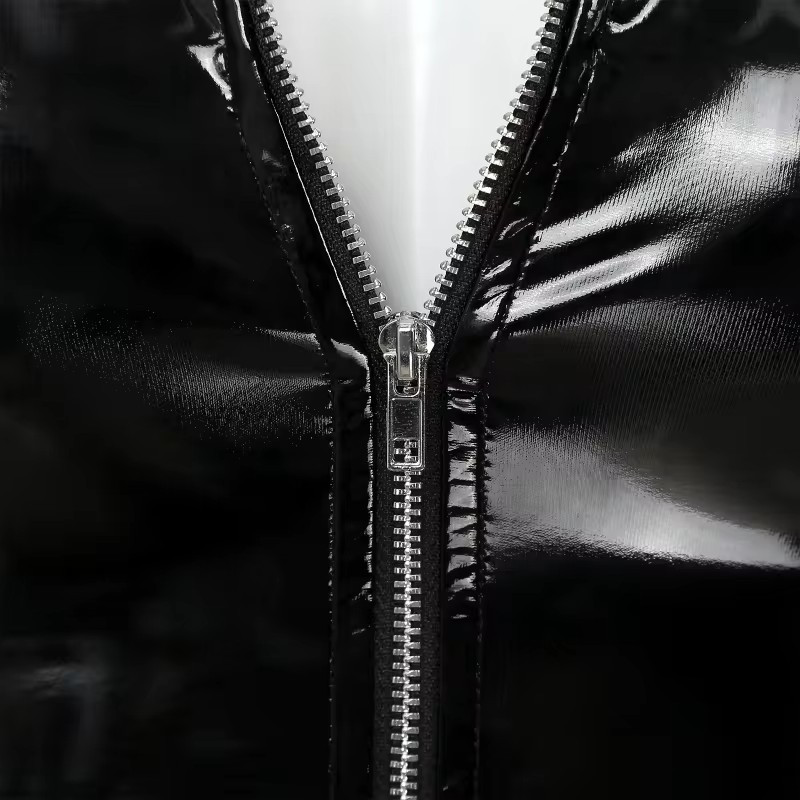 Spīdīga izskata, V izgriezums ar rāvējslēdzēju priekšā, bez piedurknēm, plīšu A-līnijas dizains.