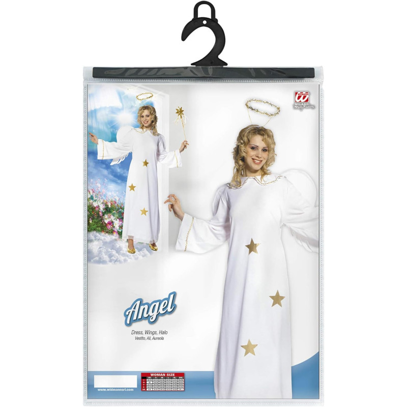 Eņģeļa kostīms sievietēm ietver kleitu, spārnus un nimbu. Kleitas materiāls: 100% poliesters.