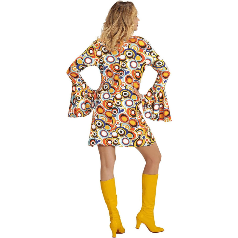 70. gadu stilīgā īsā sieviešu kleita ar košu rakstu un garām piedurknēm.