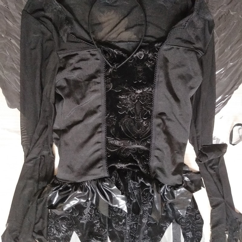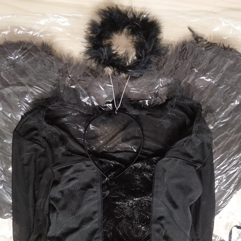 Paaugstiniet savu klātbūtni jebkurā pasākumā ar šo izsmalcināto tumšo eņģeļa tērpu. Izstrādāts, lai iepriecinātu, tas ietver sarežģītas detaļas, kas iemieso gan eleganci, gan noslēpumainību. Ideāli piemērots, lai radītu neaizmirstamu iespaidu, šis komplekts uzlabo jūsu pievilcību ar savu rafinēto estētiku. Ideāli piemērots tematiskiem pasākumiem, ballēm vai jebkuram notikumam, kas prasa neparastu pieskārienu.